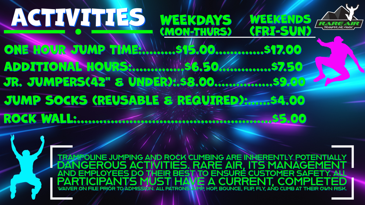 • Reusable Rare Air Jump Socks are required for all Jumpers.
